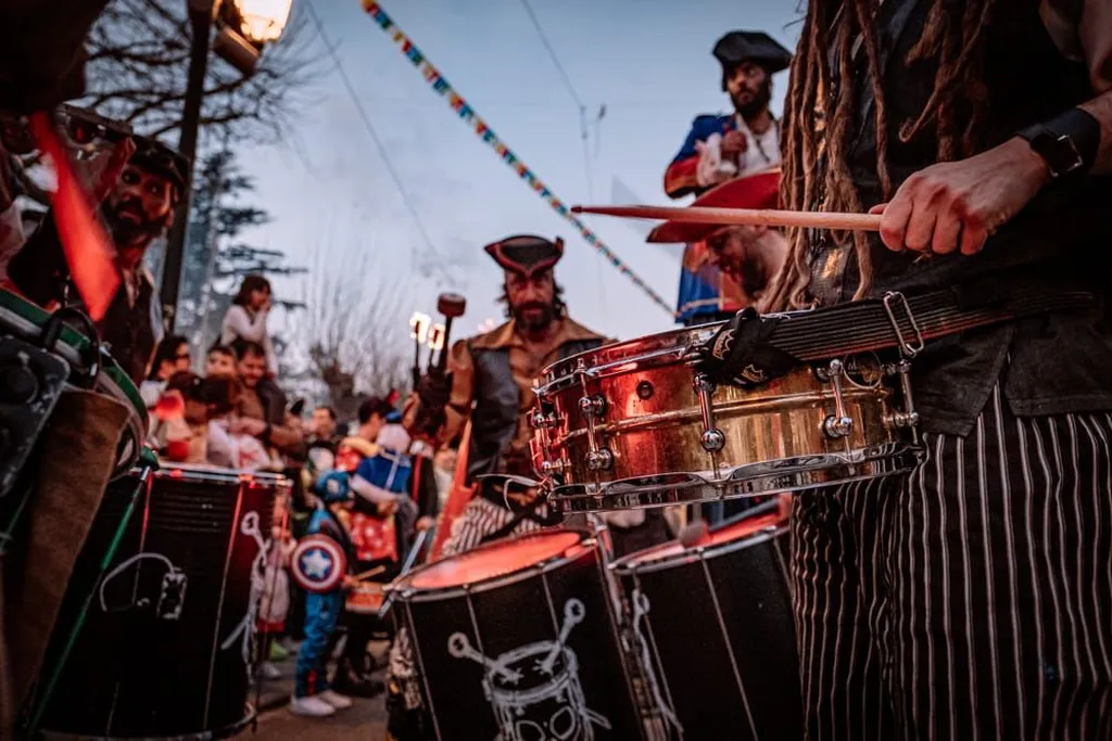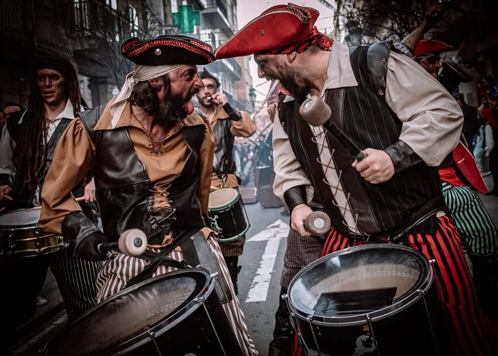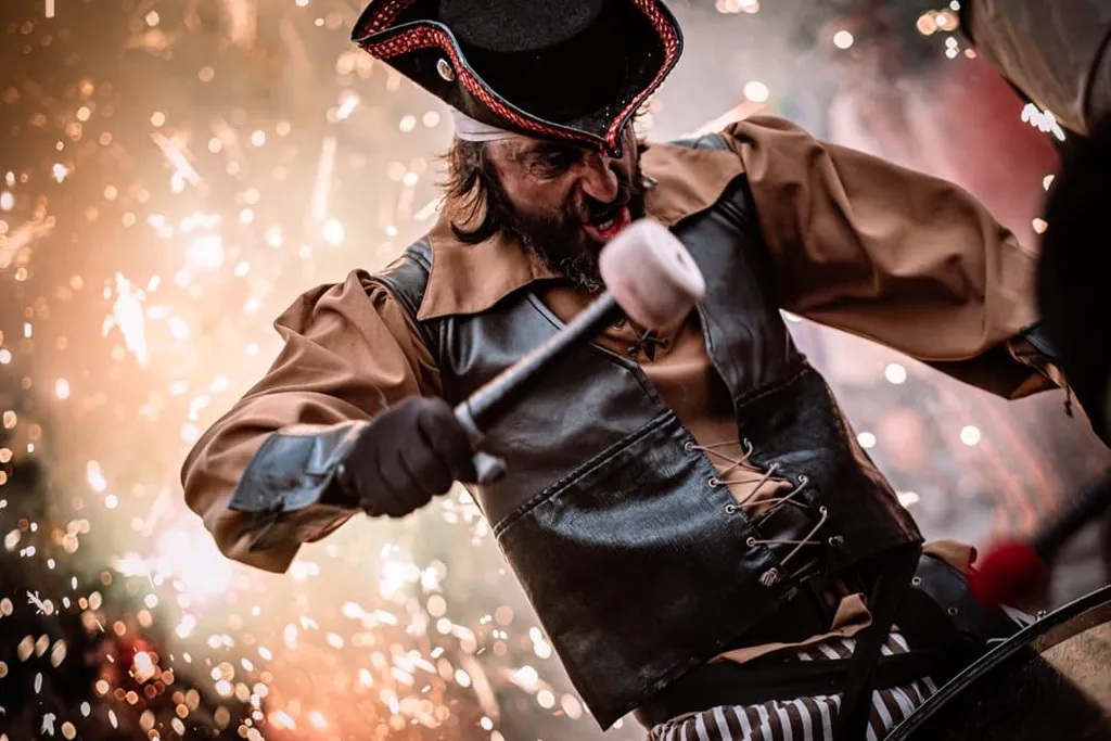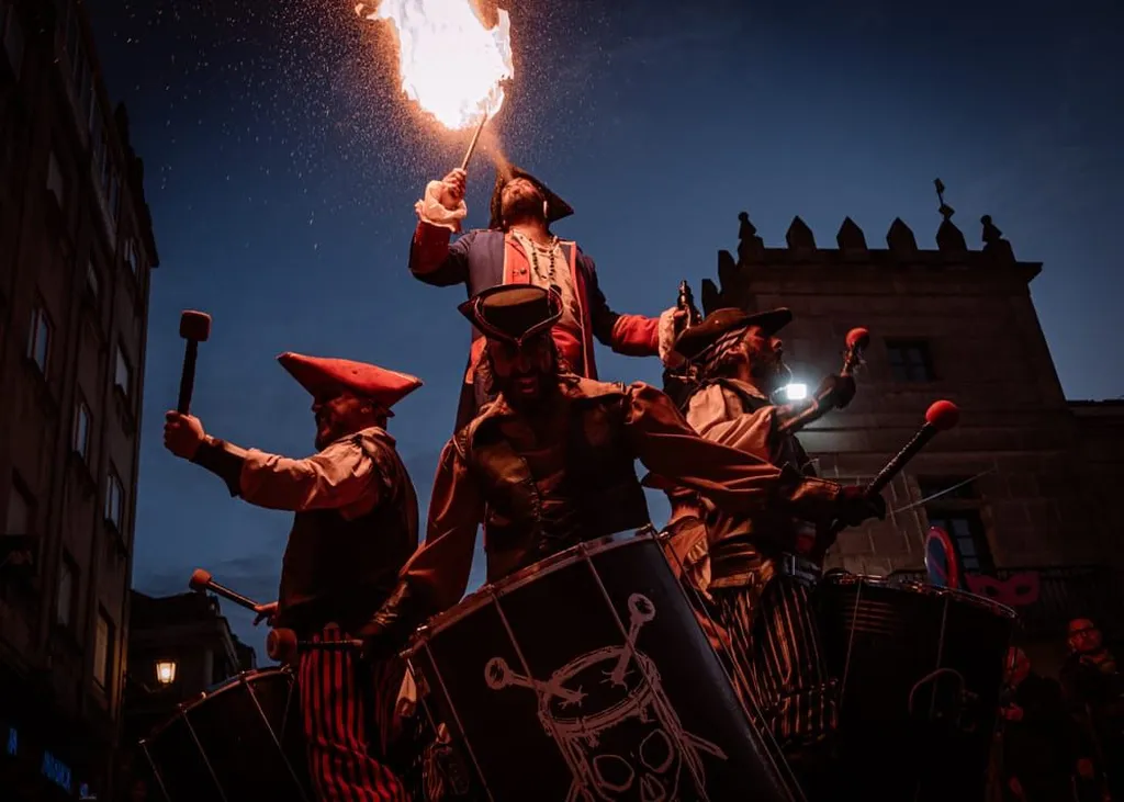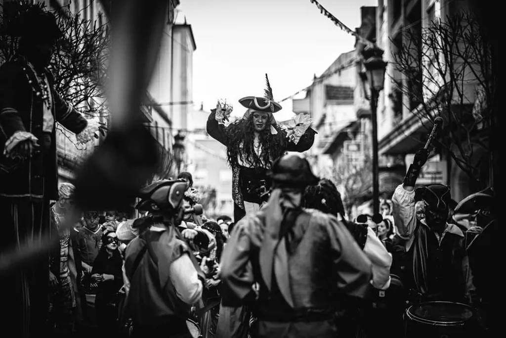 (13 persoas) | 2 zancud@s | 1 Malabarista | 1 Pirata canoneira | 1 Pirata pirotécnico | 1 Manipulador do esqueleto (2,5m) | 6 Piratas percusionistas | 1 técnico.